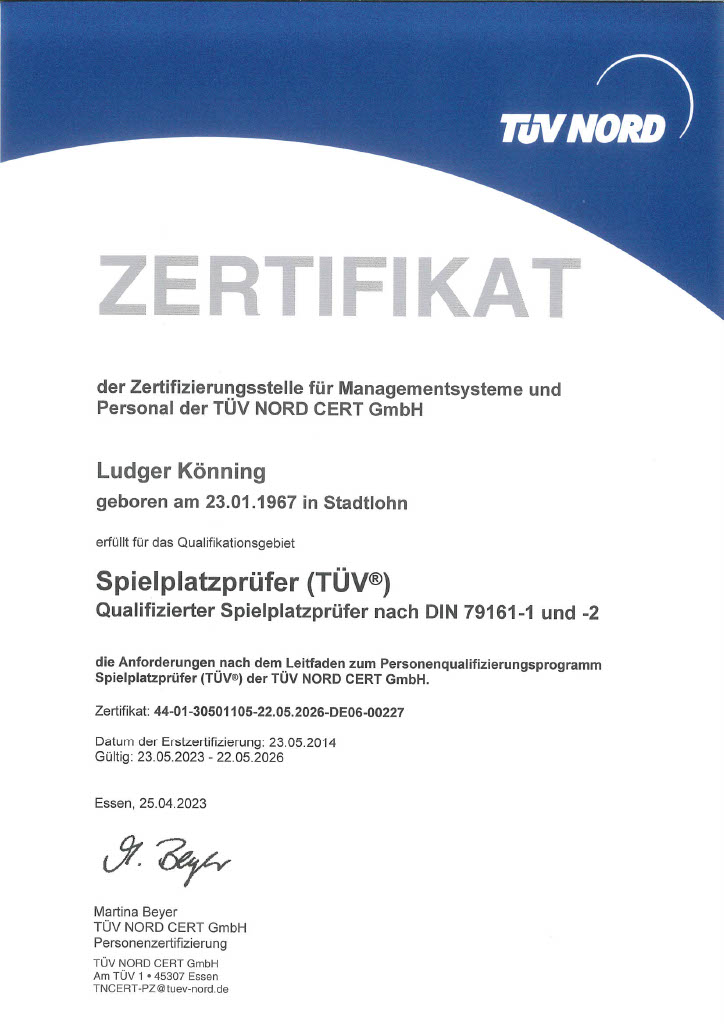 Seit 2014 ist Ludger Könning als qualifizierter Spielplatzprüfer tätig. Vom TÜV Rheinland ist er berechtigt, Spielplätze auf ihre Sicherheit zu prüfen.